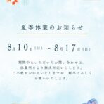 2025/08/08平素は格別のご高配を賜り、厚く御礼申し上げます。 2025年8月10日(日)より8月17日(日)まで、夏季休業とさせて頂きます。 ご不便ご迷惑をお掛けしますが、何卒宜しくお願い申し上げます。 尚、通常営業は、8月18日( …